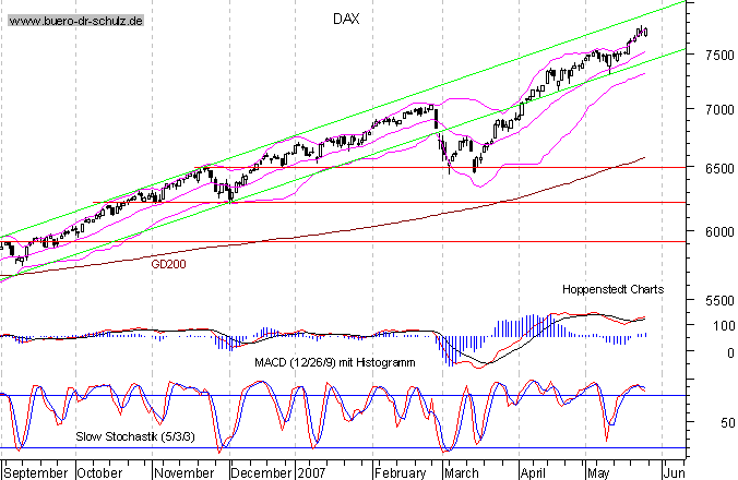 "Angesichts eines Kursanstiegs im Dax von über 1000 Punkten in nur rund zwei Monaten besteht Konsolidierungsbedarf", warnen die Aktienstrategen der genossenschaftlichen DZ Bank. In der bevorstehenden nachrichtenarmen Zeit würden Risiken wie der zuletzt wieder hohe Ölpreis, die deutlich anziehenden Kapitalmarktzinsen und die von der Bank erwartete anhaltende Dollarschwäche in den Vordergrund treten und die Aktienmärkte belasten, argumentieren sie.