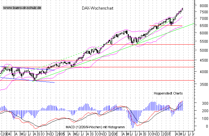 HB FRANKFURT. Nachdem der Dax am Mittwoch 7 700 Punkte erreichte, kam der Markt nicht mehr von der Stelle. "Alle wollen das Allzeithoch sehen", sagte Marktstratege Mirko Pillep von der Helaba. Doch die Anleger trauen sich nicht aus der Reserve: "Keiner will die letzten fünf Euro nach oben verpassen - aber keiner will auch bei den 100 Euro nach unten dabei sein", sagte Pillep. Dennoch ist er zuversichtlich: "Solange keine einschneidenden Dinge passieren, dürfte es weiter hoch gehen".