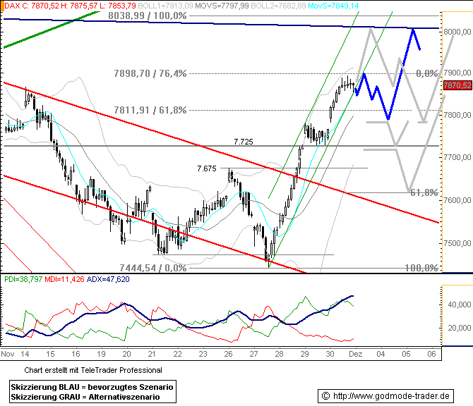 Ich hatte Ihnen am Freitag letzter Woche das folgende Dreieck im Dax vorgestellt. So hat es sich bisher weiter entwickelt: