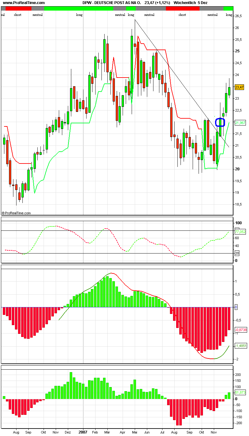 Diese Ungenauigkeiten an der oberen wie unteren Linie, die teilweise extreme Dynamik: Das alles weist auf große Unsicherheit hin, die im Zuge der Subprimekrise auch nicht verwundert. Unsicherheit ist eben Kern einer jeden Seitwärtsbewegung. Die Bullen und Bären schaffen es nicht, die Kurse maßgeblich in eine Richtung zu ziehen, eine typische Patt-Situation.