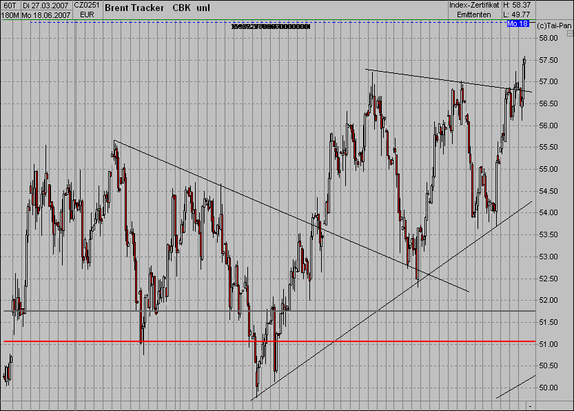 Mit dem Übertreffen des letzten Hochpunktes steht nun der Angriff auf die historischen Höchstkurse an. Unter mittelfristigen Aspekten lässt sich dabei festhalten, dass der Index seinen Trend im Rahmen der Dow-Theorie weiter bestätigt und keinerlei Anzeichen für eine Wende vorliegen. Kurzfristig dürfte sich jedoch die obere Gerade des aufwärts gerichteten Trendkanals auswirken, die in dieser Woche auf dem Niveau des All-Time-Highs rangiert. Damit lässt sich ein sog. Kreuzwiderstand konstruieren, der den DAX vermutlich kurzzeitig aufhalten kann. Auf Sicht mehrerer Tage rechnen wir aber mit einem - unspektakulären - Bruch dieser Marke. Erst dann stehen wahrscheinlich erneute heftige Rücksetzer auf der Tagesordnung.