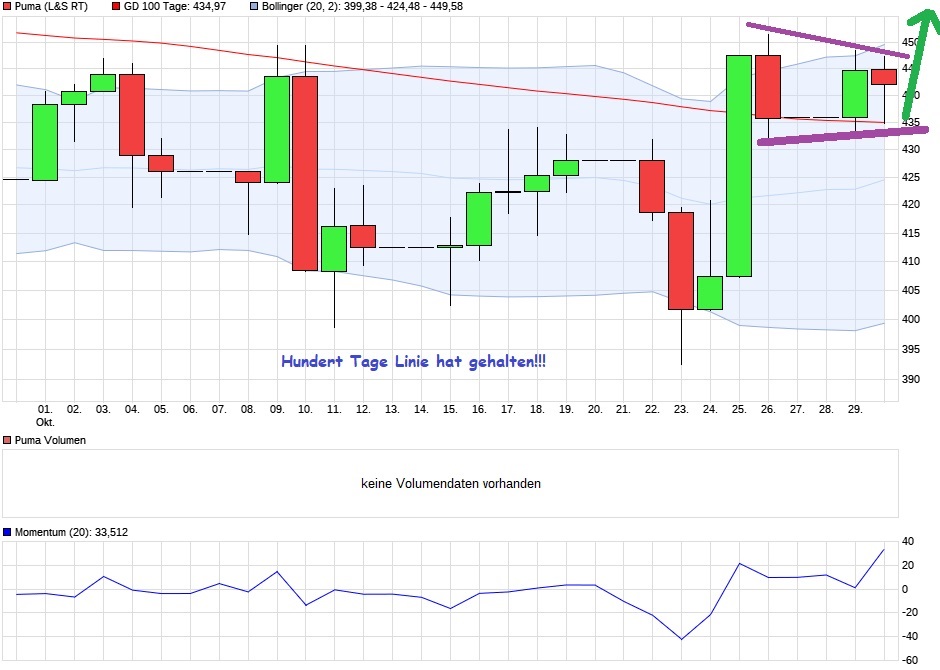 Die Frage ist wird der Markt den puma nochmal quälen wollen. Die Positionierung ist Top. Geld ist da und 2 stellige Wachstumsraten in Asien. Bin gespannt auf q4. Vllt schaffen wir einen Ausbruch nächste Woche wenn der Markt sich einig ist. Schwäche werde ich auf jedenfall Kaufen. Ziel kurzfristige die 500 Mittelfristig 550. In einem Zeitraum von 2 Jahren 950 Euro