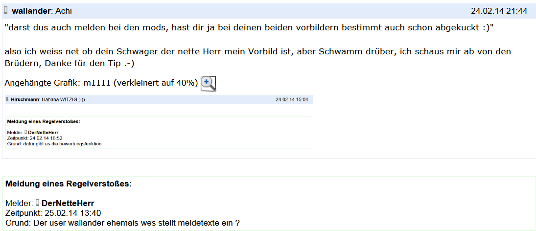 das mit den Meldetexten war so, dass man sie einstellen darf, wenn es dem Diskussionszweck dient (Auskunft mod) und in diesem fall dient es dem Diskussionszweck, da du ja Leute meldest und aufforderst die 'Bewertungsfunktion' für eine 'witzig' Bemerkung durch @Hirschmann zu verwenden, etwas, an das du dich selbst nicht halten möchtest... wie sollte man sonst erklären, wie unsinnig deine Melderei ist? siehst du, daher wird es eingestellt, auch bei ineinandergreifenden Meldungen, mit dem Ziel, das alte post rasch zu entfernen .-) das würde den Diskussionsfaden ja unlautererweise abschneiden und so könnte man es nicht mehr verstehen. Gruß