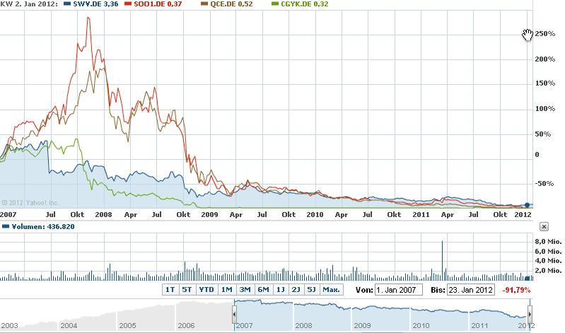 Anhängend prozentualer Entwicklungsvergleich seit 2003 SWV.DE, SOO1.DE, QCE.DE, CGYK.DE
