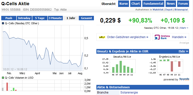 Was kann man bei einem Aktienkurs von 0,155 Euro schon falsch machen? Eine ganze Menge. Denn immerhin summiert sich der Börsenwert von Q-Cells trotz dieses optisch sehr niedrigen Kurses noch immer auf 27,5 Millionen Euro. Nicht eben wenig für ein insolventes Unternehmen. Zum Vergleich: Die ebenfalls insolvente Solarfirma Solon wird mit lediglich 1,4 Millionen Euro bewertet.
