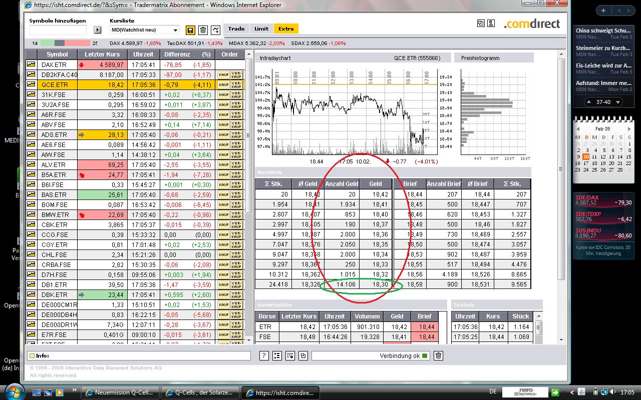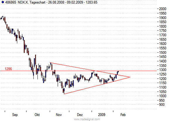 Das ist insofern erstaunlich, da die Meldungen von den Unternehmen (zum Teil deutliche Verluste im vierten Quartal 2008, häufig keine konkreten Ausblicke für 2009) als auch die Konjunkturdaten (Arbeitsmarkt, Konsum, Investitionen, ...) praktisch seit Wochen durchweg negativ waren. Einzelne kleine Lichtblicke, wie ein etwas erholter ifo-Index, bestätigen als Ausnahmen nur diese Regel.
