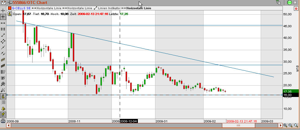 713,52 Punkten (Stand: 15:00 Uhr). Seit Mitte Dezember bewegt sich der RENIXX seitwärts in einer Bandbreite zwischen 600 und 800 Punkten. Die beginnende Berichtssaison hat die Kurse in dieser Woche geprägt. Zwei deutsche Solaraktien stehen zum Wochenausklang auf der Verliererliste ganz oben. SolarWorld verlieren 10,6 Prozent auf 15,66 Euro und Q-Cells geben um 10,2 Prozent auf 17 Euro nach. Gewinner der Woche ist die Aktie des Spezialsägenherstellers Meyer Burger (+17,7 Prozent, 63,99 Euro).
