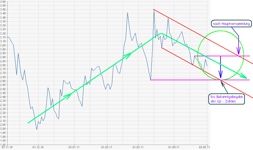 Damit wir wieder in den Aufwärtstrendkanal von Dez '10 reinkommen, müsste der Kurs aber auch Tagesschlussbasis auf bzw. über 3 Euro kommen.