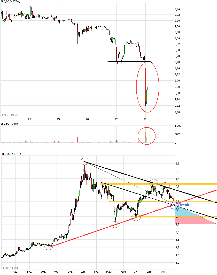 Das war nach dieser deutlichen QSC Schwäche von gestern ja fast schon zu befürchten gewesen. Diese potenzielle SL Welle hatte ich gestern angesprochen, für den Fall man kippt aus dem "Keil" nach unten raus. Damit ist jetzt sowohl die horizontale Unterstützung bei roundabout 2,80€ aufgegeben worden, wie auch jetzt noch der 10 monatige Aufw.trend unterschritten. Man muß jetzt mal intraday beobachten, ob es lediglich nochmal ein Kissback an das gebreakte Level gibt oder ob es wieder darüber geht auf SK. In letzterem Fall könnte man dann annehmen hier waren größere SL Fischer am Werk und die Sache nur ein False Break. Ich fürchte aber der Break wird nachhaltig sein. Aufgrund dieser frischen Verkaufsignale besteht nun die Gefahr weiterer Anschlußverkäufe in der kommenden Zeit. Von daher sehe ich erst wieder Kaufgelegenheiten, wenn es wieder klar über 2,80€ geht oder man einen neuen Boden ausbildet, wobei z.B. das Low von Anfang Mai so ein Punkt sein könnte.