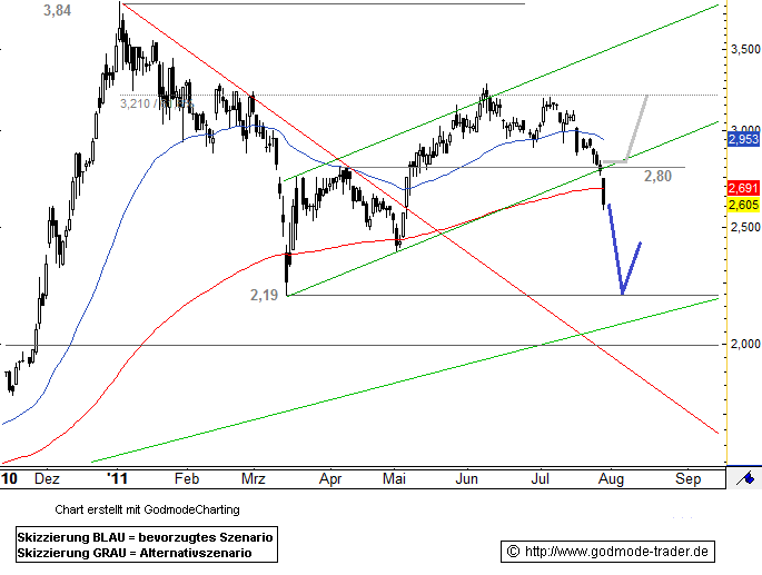 In den nächsten Tagen dürfte die Aktie von QSC weiter stark unter Druck stehen. Abgaben gen 2,19 Euro erscheinen realistisch. Sollte der Wert allerdings über 2,80 Euro zurückkehren, dann wäre eine Rally in Richtung 3,21 Euro möglich.