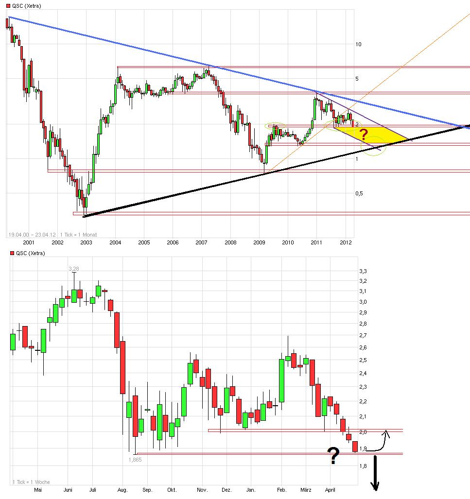 Also das Thema Insolvenzkandidat und QSC passen natürlich nicht zusammen. QSC ist nicht Solarworld. Ich denke auch das irgendwann natürlich auch mal wieder eine technische Gegenreaktion nach oben kommt. Ich sehe halt nur gegenwärtig wie die Kurse einfach keinen Boden finden, egal ob der Tecdax steigt oder fällt. Die Frage ist wer ständig weiter Aktien abgibt und jeden Erholungsansatz verhungern läßt und sogar die 2€ wieder nach unter durchschlagen läßt. Sind das noch die "Spähtwehen" von der Baker-Rückgabe an die Fondeigner ( www.qsc.de/de/qsc-ag/investor-relations/...c783d863384a4b05d88 - vielleicht wollten doch einige von denen nicht sofort verkaufen in der Hoffnung es geht nochmal weiter nach oben und die werfen jetzt erst die Flinte ins Korn) ? Oder verkaufen da welche die nähere Informationen bereits haben über die laufenden Geschäfte? Keine Ahnung. Daher richte ich mich erstmal weiter nach Chartsignalen. Und da ist momentan noch kein Boden bislang absehbar. Besonders nicht nach so einem Tag wie heute. Warum macht QSC nicht ein Aktienrückkaufprogramm als positiven Impuls? Seit vermelden der mauen 2012 Prognose ist vom QSC-Management nach außen nichts mehr zu hören und die kleinen Anleger dürfen die Suppe ausbaden.