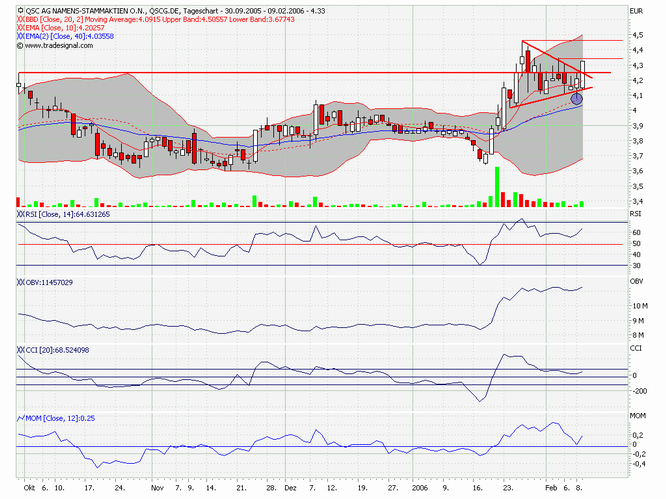 Diagnose/Prognose: Die QSC Aktie legte vom Tief am 18.01.2006 bei 3,64 Euro eine steile Rallye hin, in welcher die Aktie wichtige Widerstände überwand. Sie brach zunächst über das 3. Element eines bullische Fächers und bestätigte diesen Ausbruch durch Überwinden des Widerstands bei 4,10 Euro. Nach einem Hoch am 26.01.2006 bei 4,46 Euro setzte die Aktie einige Tage zurück. Im gestrigen Handel markierte die Aktie ein Tief bei 4,08 Euro. Von dort aus zieht sie stark an und nähert sich bereits wieder dem Hoch bei 4,46 Euro an. Damit setzt die Aktie nun die übergeordnete Aufwärtsbewegung fort. Das nächste Ziel liegt bei 4,84 Euro, später sind dann Gewinne bis zum Hoch aus 2004 bei 6,28 Euro realistisch.