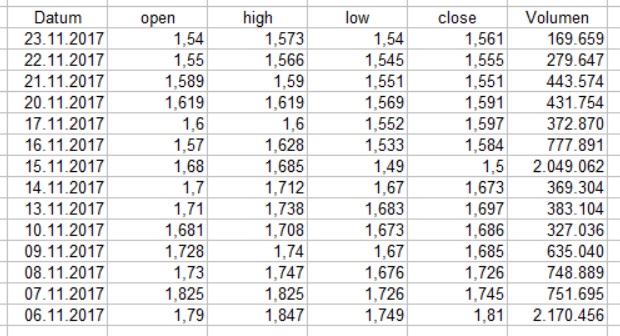 auf die Kurshistorie der letzten Zeit zeigt ,daß der Ausstieg von F&H mit insgesamt 250K am 15. November (obwohl erst am 17. verkündet) den gleichen Umsatzeffekt auf Xetra hatte ,wie die Q3-Zahlen am 6. November.