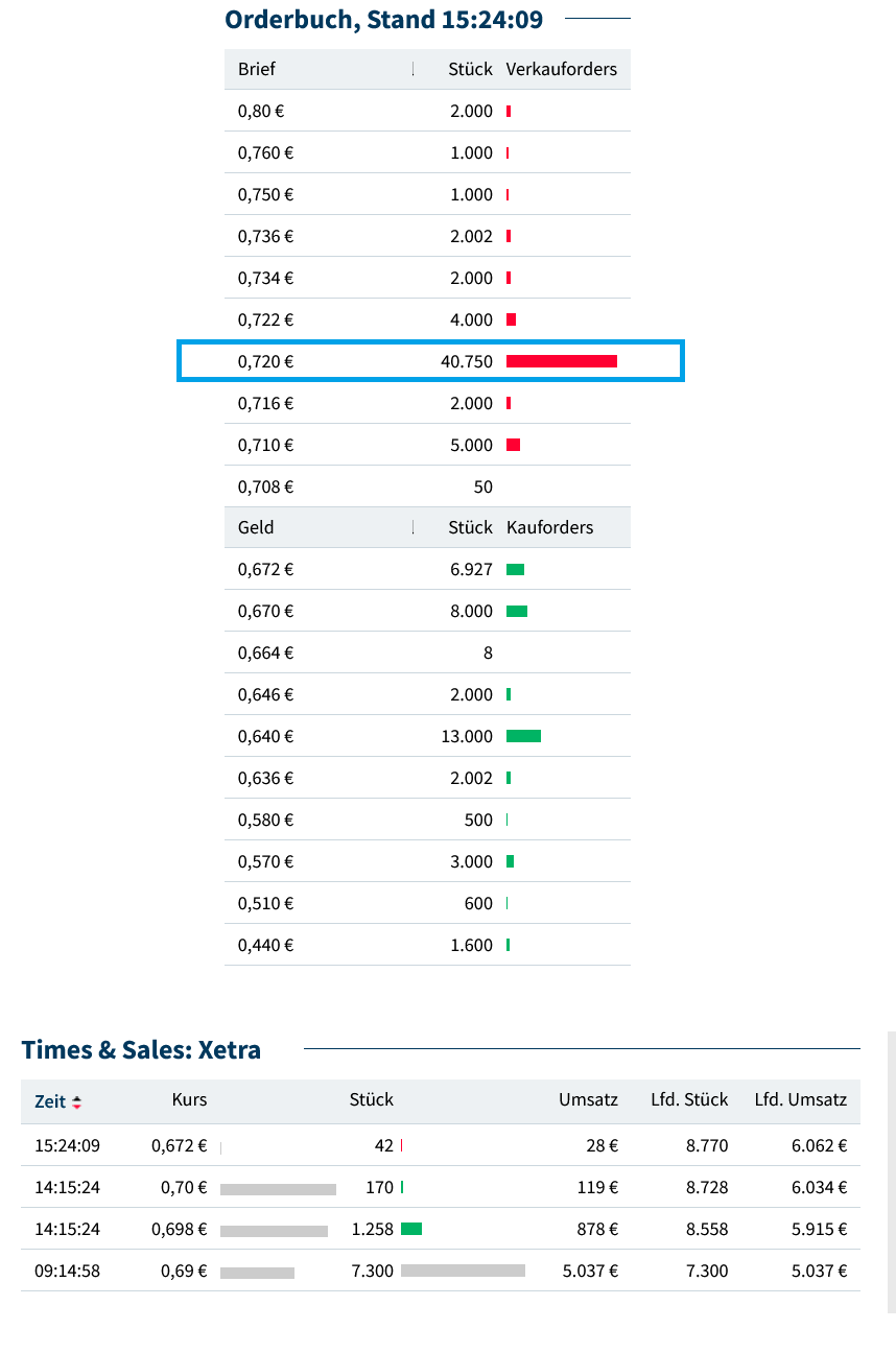 Wenn ich mir die im gesamten Tagesverlauf abenteuerlich hohe Bid - Ask Spanne anschaue und die Orderstruktur auf Tradegate, dann treiben hier einige Kleinaktionäre im Umfeld der charttechnisch hochrelevanten SMA200 (Stand heute: 0,66 €) ihre Spielchen.