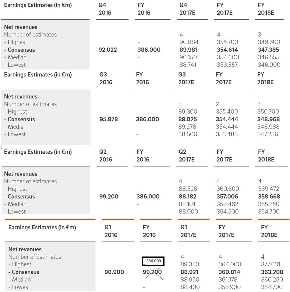 Man sieht, die Erwartungen für 2017 haben sich stabilisiert auf die 355 Mio. Prognoseuntergrenze und die Umsatzerwartungen für 2018 haben sich im Jahresverlauf noch erheblich nach unten bewegt.