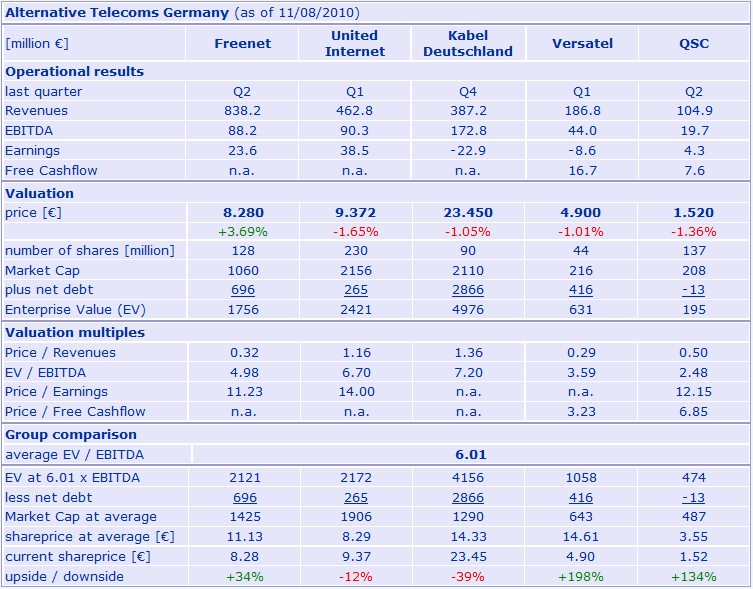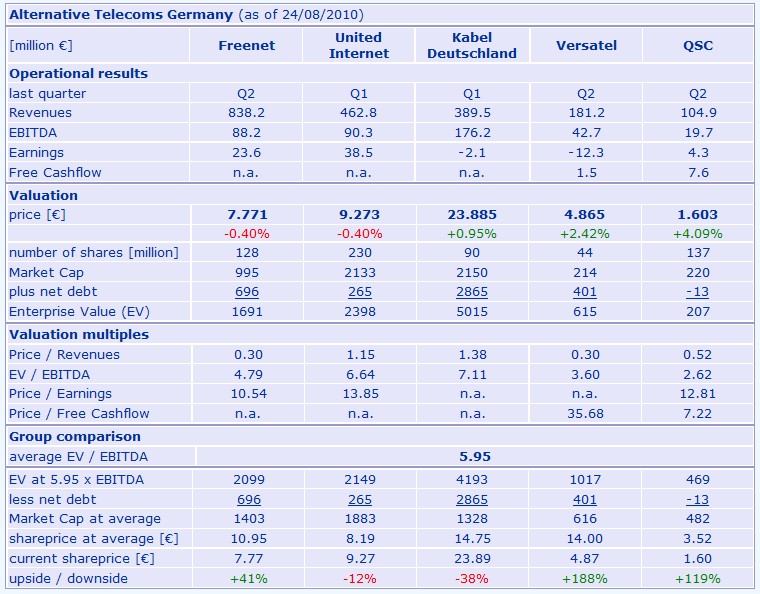 Europaeische Incumbent-Festnetze werden mit c. 4.5-5x EBITDA bewertet. Sie wachsen nicht, aber sie sind deutlich free cash flow positiv, was man bis jetzt leider von keinem alternativen Anbieter behaupten kann. Der Regulierer schuetzt, bis zu einem gewissen Grad, die Returns auf das Kupfer. Ich bin mit meinen Festnetzbewertungen tendenziell unter dem Marktdurchschnitt
