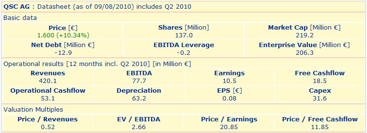 Versatel, mit einzigartiger lokaler Glasfaser und hohen lokalen Kundenkonzentrationen (in 60% der deutschen metropolitan areas) ist hier komplett anders aufgestellt als QSC, die eine me-too Infrastruktur und (fast) keine eigenen Retailkunden besitzt. Daher ist Versatel aus meiner Sicht ein wesentlich plausiblerer Uebernahmekandidat.