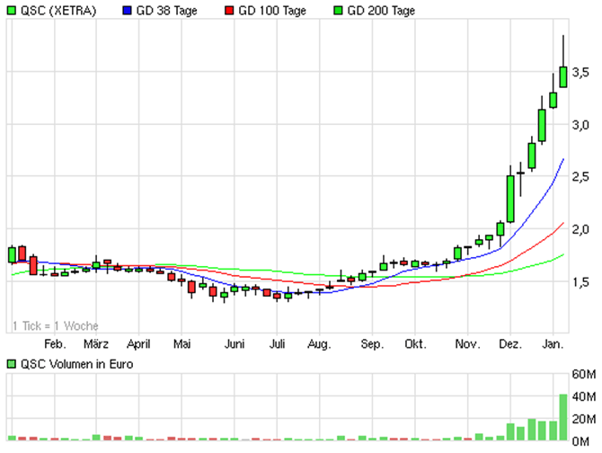 Schaut Euch bitte mal den Link zu "Kursdiamenten" an. Die schrieben über QSC vollkommen inhaltsfrei. Es gibt lediglich eine Kaufempfehlung bei Kursen unter 3 Euro. Was soll das? Einfach so daher geschrieben. Das kann doch jeder. Ich war in QSC investiert und bin ganz ehrlich, ich hatte immer ein wenig Bauchgrummeln. War aber mutig genug bei Niedrigkursen unter 2 Euro nachzulegen. Ich habe bei Kursen über 3.50 bis auf einen kleinen Teil alles verkauft. Und dabei einen ordentlich Gewinn gemacht. Ich bin mir nicht sicher, ob ich nochmals einsteigen werde. Es handelt sich bei der Aktie nach meinem Bauchgefühl um eine Zockeraktie im positiven Sinn. Schnelles Geld ist damit bestimmt zu verdienen, da sie Kurse offenkundig enorm schwanken. Ich habe sowas schon oft erlebt und am Schluss haben sich die meisten Papiere auf einem äusserst niedrigen Niveau festgebissen. Unerheblich ob dabei Substanz vorhanden war oder nicht. Und mal ehrlich, es ist wesentlich beruhigender Bluechips auszusitzen, oder etwa nicht. In diesem Sinne.
