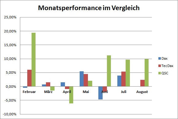 Deine Einstellung, Ananas, ist sicherlich nicht so verkehrt. Alles was gegen den Trend steigt muss stark sein und umgekehrt. Dazu mal eine kleine Auswertung zu QSC. Die jeweilige Monatsperformance von Dax, TecDax und QSC auf Basis der Schlusskurse im Vergleich (Datenquelle: Yahoo Finance). Der Februar ist natürlich sehr auffallend, genauso stark aber die Monate Juni-August (August bis einschließlich Schlusskurs 21.08.)