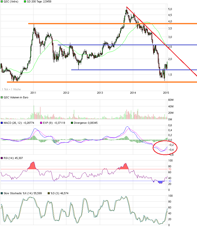 Ich geh weiter davon aus, dass QSC wie von mir mehrfach geschrieben, ein schlechtes Q4 hatte. Die Frage ist nur, was fundamental und vor allem psychologisch Ende 2014 eingepreist wurde. Der Chart gibt uns dazu Aufklärung. Offensichtlich sehen die Anleger wieder Licht am Ende des Tunnels. Es wäre ja bescheuert, wenn man als Anleger stur bearish bleibt, wenn sich die zeiten geändert haben. Dann würde ich ja genau den gleichen Fehler machen, den deuteronium hier über ein jahr lang gemacht hat und dem ich ihm vorgeworfen habe, als er stur an seinem Investment klebte. Der Chart sah damals vielfach schlecht aus. Es gab immer genug Möglichkeiten auszusteigen. Und genau so seh ich es jetzt andersherum. Es gibt jetzt noch Möglichkeiten einzusteigen. Wie hoch es geht, werden wir sehen. Niemand hat die berühmte Glaskugel. Ich muss mich auf die Chartanalyse verlassen. Es wäre insofern nett, wenn du deine Vorwürfe ein wenig überdenken könntest. Es geht hier nicht darum recht zu behalten, sondern darum durch vernünftige Analyse Geld zu verdienen. Und meine Meinung zu QSC hat sich nun wirklich nicht groß verändert. Ich hab nur ne andere Meinung zum Kurspotenzial. Den Widerspruch werden Leute natürlich nicht verstehen, die eindimensional denken.