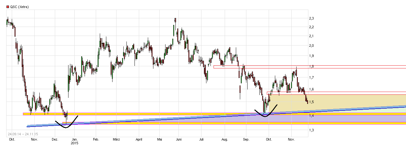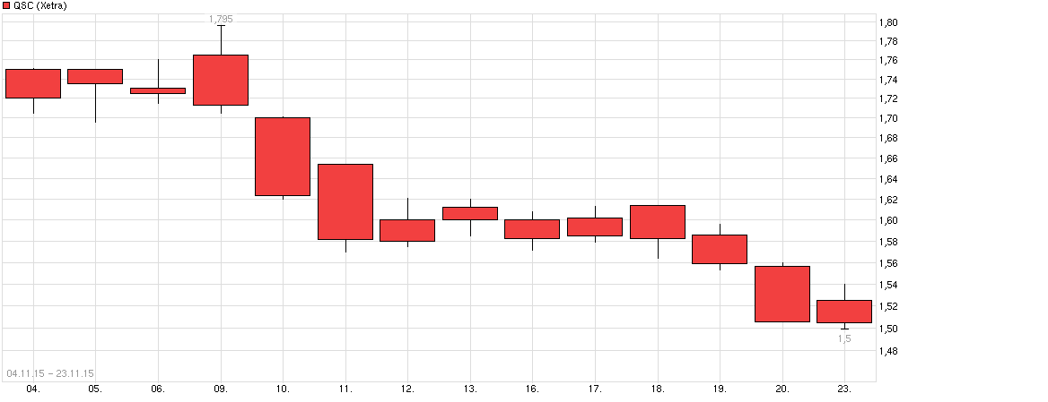 Ich glaube, wenn das Unternehmen in diesem letzten Quartal 2015 einen Umsatz von 100 Millionen machen will, wäre allein das schon eine positive Überraschung. Doch hege ich Zweifel daran, QSC lebt im Augenblick auf Kosten der Substanz. Ob die „ Stammkundschaft“ den Dienstleister den 100 Mio. Umsatz bringt, das kann ich nur hoffen.