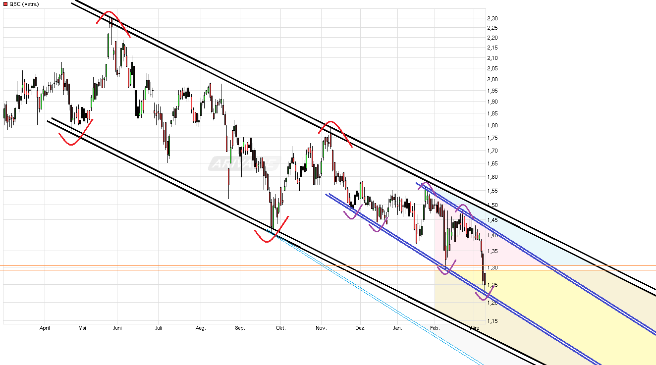 kurzfristig an der Unterseite des blauen Abw.trendkanals angekommen, was vielleicht weitere schnelle Absacker verhindern könnte, wenn man in dem Kanal bliebe. Aber dieser blaue Abw.trendkanal bewegt sich seit Herbst 2015 selber auch noch in dem etwas längerfristigen schwarzen Abw.trendkanal. Man hatte es zu Jahresanfang auch nichtmals geschafft wieder den oberen Rand des schwarzen Abw.trendkanals zu tangieren. Von daher scheint dieser blaue Abw.trendkanal etwas dominanter zu sein. Aber egal welchen Kanal man nur nimmt, es geht übergeordnet eben darin abwärts solange kein klarer Ausbruch nach oben erfolgt und man nur darin rumpendelt. Schwache Zahlen und schwacher Ausblick in Kombination mit einem TecDax Rauswurf sind momentan auch nicht gerade der Lockstoff um viele neue Investoren zu ködern. Der Break der 1,29/30 war erwartungsgemäß auch nicht nützlich, da nun eine langjährige mehrfache Unterstützungmarke unterschritten wurde, die nun vielleicht zur künftigen Widerstandsmarke mutieren kann an die vielleicht nur der ein oder andere Pullback mal wieder erfolgt. Sollte man sogar die Unterseite des blauen Abw.trendkanals bald durchbrechen, dann könnte es zusätzliche Dynamik geben in Richtung der Unterseite des schwarzen Abw.trendkanals. Und der liegt z.Z. bei ca. 1,10/12. Von daher alles dünnes Eis auf dem man steht. Da müßte erstmal wieder eine NACHHALTIGE klare Rückkehr über 1,29/30 erfolgen und die diversen Abw.trendkanäle nach oben durchbrochen werden bevor hier wieder etwas mehr Licht hinter den dunklen Kurswolken wieder zu sehen wäre.