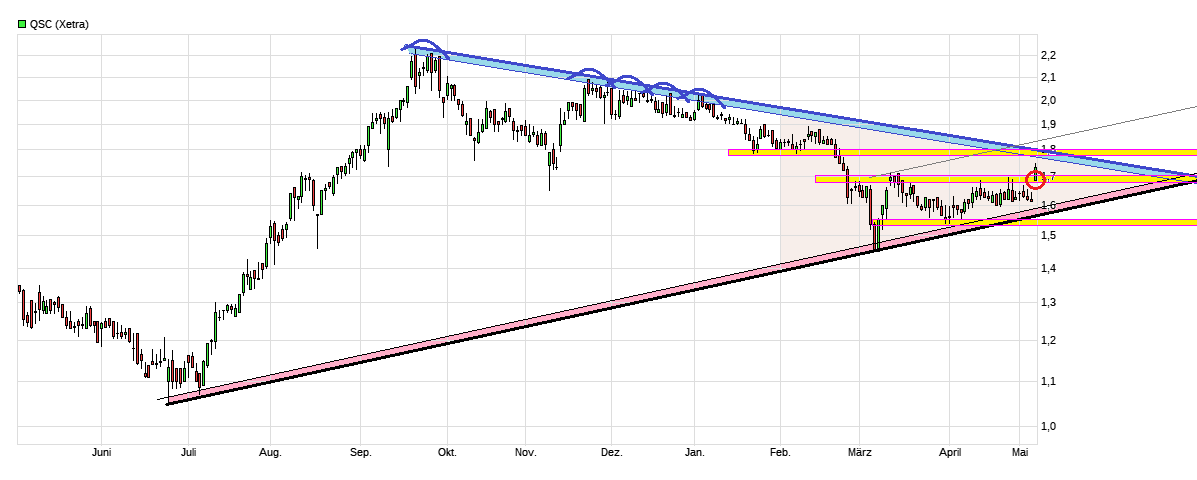 da lediglich die alte (unschöne) 2017er Prognose nochmal bestätigt wurde (die ja den Kurs damals nach Verkündung so nach unten zog => www.it-times.de/news/...eim-itk-dienstleister-in-sicht-122997/ )). Aber vielleicht erhoffen sich ja die Leute inzwischen, daß diese 17er Prognose zu konservativ ist und es noch Anpassungen nach oben geben wird im Jahresverlauf. Das gegenwärtige operative Geschäft ist ja in der Summe weiter nicht so prall, da massive Umsatzeinbrüche im noch immer dominaten Geschäftsbereich Resell stattfinden und der Bagatellbereich Cloud weiterhin noch so winzig ist, daß selbst mit gutem Wachstum dort diese anderen Umsatzeinbrüche nichtmals ansatzweise aufgefangen werden können in 2017. Letztendlich ist der aktuelle Kursanstieg somit wohl mehr eine Hoffnung bezogen auf 2018 ff, daß dann die Cloudumsätze zunehmend an Gewicht gewinnen und der aktuell siechende Resellerbereich mal wenigstens in eine stabile Phase kommt anstatt immer weiter nur massiv Umsätze zu verlieren. Somit steht halt das Wachstumstempo im Cloud-Bereich besonders im Fokus, als Hoffnungsstrohhalm im ansonsten eher mauen Zahlenmix. Die Zahlen sahen ja jetzt in erster Linie nur besser aus bezogen auf das Vorjahr, weil man auf der Kostenseite die Einmaleffekte nicht mehr hatte die die im Vorjahr noch hinzukamen durch den Personalabbau ( als Spätfolge der vorhergehenden Flopstrategie des aktuellen Vorstands). Daher für mich nicht wirklich überraschend was jetzt gemeldet wurde. Aber vielleicht haben einige Leute doch mit noch schwächeren Zahlen gerechnet. Wie dem auch sei, es wurde die horizontale Widerstandsregion um 1,70/71 zur Eröffnung geknackt. Allerdings mit einem Gap, was eventuell nochmal geschlossen wird ( aber natürlich nicht geschlossen werden muß). Nächster großer Knackpunkt wäre die Region um die 1,79/80. Hier liegt der nächste horizontale Widerstand und es liegt auch die Abwärtstrendlinie in der Nähe, die seit September 2016 fällt. Wäre also ein starkes Signal, wenn man diese Kursregion in der nächsten Zeit knacken könnte. Auf der anderen Seite waren aber die aktuellen Zahlen noch nicht sp prall, daß man dies nun erwarten müßte. Da könnte es auch sein, daß man eventuell erstmal die Hj1 Zahlen und eine dann mögliche Prognoseanpassung nochmal abwarten wird und man eher wieder in eine Seitwärtsbewegung bald übergeht bzw. in die nächste "Warteschleife" bis die nächsten Fakten wieder auf den Tisch gelegt werden. Solange man jetzt nicht mehr unter die seit Juli 2016 stetig weiter steigende Aufw.trendlinie läuft (z.Z. bei ca. 1,60) ist alles erstmal noch im Lot. Wird sich in den kommenden Wochen und Monaten dann zeigen, welcher der beiden Trendrichtung die stärkere Seite sein wird. Angenehmer wäre natürlich die positive Richtung.