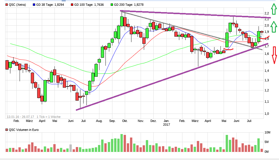 Nachdem der Kurs zuletzt ehrlicherweise ohne fundamental relevante News schnell anzog, kommt es aktuell schon wieder zu Gewinnmitnahmen. Lediglich der altbekannte Wirschaftskrimminelle Maydorn ( verurteilt zu 2 Jahren wegen Jüngerabzocke/Scalping/Marktmanipulation - de.wikipedia.org/wiki/Der_Aktionär , www.wiwo.de/finanzen/boerse/...e-mit-der-justiz/8681070-3.html ) hatte mal wieder den "Gier-frißt-Hirn"-Schalter gedrückt und einfach völlig übertriebene 3 Euro in den Raum geworfen, damit die reflexartig tickenden "Jüngerschaft" wieder blind und unlimitiert durchs "Nadelöhr" nachrennt und den Kurs schnell dabei hochjagt und als Papagei dieses KZ des verurteilen Manipulateurs auch überall nachposaunt. Wer die Aktie schon länger verfolgt, dem ist ja bekannt, daß dieses Strohfeuerspiel von den Kulmbachern die letzten Jahre bei dieser Aktie bekanntlich schon mehrfach betrieben wurde. Gibt genug Gemütern die auf diese Abmelkmasche immer wieder anspringen. Bestimmte "Lieblingsaktien" der Kulmbacher Melkfabrik werden eben immer wieder in gewissen Abständen als Sau durchs Dorf getrieben, weil die .. hüstel.. "Experten" einfach wissen da kann man sich auf den immer gleichen Reflex verlassen. Es gab zwar im mittleren 1,6x Bereich jüngst eine technische Unterstützung und die Indikatoren waren auch überverkauft. Aber inzwischen ist der Stochi ja wieder längst im überkauften Bereich angekommen und hat nach unten geschnitten. Da hängt man jetzt in der Schwebe (gelber Bereich im Chart unten) und man bräuchte mal fundamentalen neuen Treibstoff anstatt immer nur diese "selbstlose" Pusherei der Franken. Prognoseanhebung mit den Hj.1 Zahlen z.B. wäre sicher nicht unnützlich. Da der maue Ausblick für 2017 bekanntlich weiter gleich geblieben ist nach den letzten Zahlen (massiver Umsatzeinbruch in 2017 gegenüber 2016 trotz Wachstum in der Bagatellsparte "Cloud"), ist der Wert momentan gesehen fundamental noch keinesfalls günstig auf diesem Niveau und hier hilft nur hoffen auf einen Turnaround ab 2018, um etwas Kursphantasie zu haben. Viele hoffen jede Woche auch im Lotto zu gewinnen. Mit hoffen alleine ist es nicht getan. Taten müssen folgen. Es fehlen defacto aber noch immer echte Belege dafür, daß man es NACHHALTIG schafft. 2018 dürfte das gewohnte Siechtum des Hauptumsatzbringers ja weiter anhalten und lediglich die kleine Cloundsparte etwas stützen. Von daher sollte man sich nicht voreilig schon einer Traumwelt hingeben und meinen hier wäre Cloud der Hauptumsatzbringer und die realen Problemkinder im Konzern würden über Nacht verschwinden. Wenn es zu einem Turnaround käme, dann dürfte der eher zäh und langwierig ablaufen, da eben bestimmte undynamische "Altbereiche" weiter mit durchgeschleppt werden müssen.