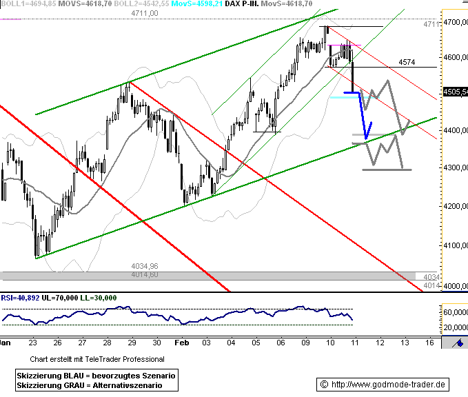 Ein DAX Handel der sich länger als 1 Stunde unterhalb von 4.600/4.625 abspielt, wäre gleichbedeutend mit einem Intraday-Verkaufssignal. Zielbereich für dieses Szeanrio ist der Bereich 4.535/4.565. Eine weitere Unterstützung ist die runde DAX Marke 4.400.