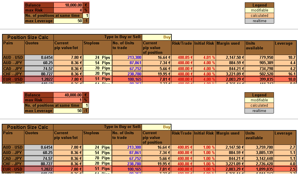 Wenn man keine 100.000 Euro hat, kann man das Ganze über Marginhandel vollziehen. Aber sollte man nicht nur die Mindestmarginvorrausetzungen (was die meisten Kontoschrotter machen) erfüllen. Wer also ein Lot EUR/USD handeln will bei einem Risiko von bspw. einem Prozent pro Trade und Stoploss von z.B. 50 pips plus 1 pip Spread bräuchte 40.000 Euro Kontogröße. Leverage wäre 2,5:1. Wer nur 10.000 als Depotgröße zur Verfügung hat, muss halt dann schon ein höheres Risiko von dann 4% pro Trade fahren (bzgl. Beispielstop!), um 1 Standardlot zu handeln. Leverage wäre dann 10:1, siehe unten.