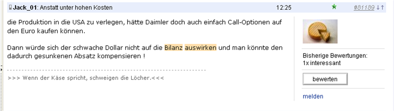 Außerdem kann doch auch ein Interessenkonflikt für Daimler entstehen - bedenke das Ein Amerikaner einen Daimler lieber kauft, wenn A, es zudem seine Wirtschaft unterstützt und B wenn es sein System nicht kaputtwirtschaften will.