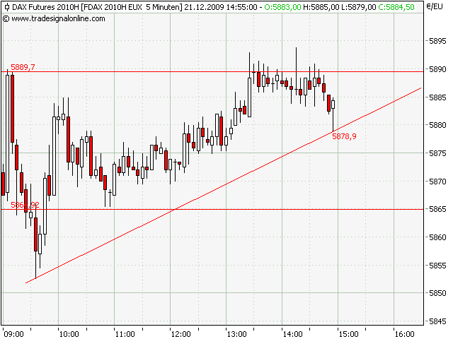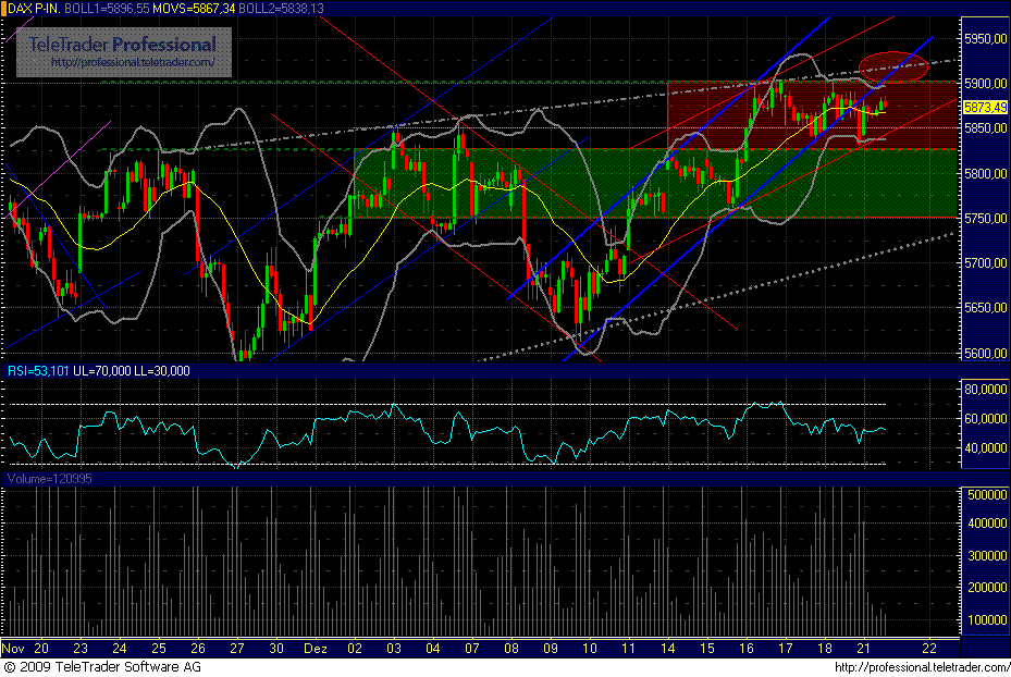 Grippewellentechnisch hatte es mich seit Mitte letzter Woche echt voll erwischt.. und immernoch nicht ganz auskuriert - wobei es bei den Temperaturen draußen im Bett sowieso schöner ist :) . Der Dax läuft nun in seinen nächsten Widerstandsbereich. Wir haben nach unten 2 Aufwärtstrends (im Chart grün), der dichteste um die 5845 im 15er Candlestick, nach oben begrenzt gerade die im Chart braun dargestellte Linie. Ein Ausbruch über diese bzw. die dich rot - markierte wäre als sehr bullisch zu betrachten. Wichtig ist, dass es nicht mehr unter 5845 - 5810 fällt, sonst droht Verlustpotenzial bis 5750 bzw. 5710 Zähler.