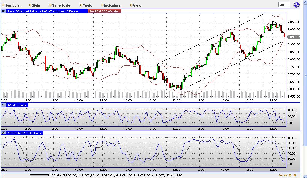 du brauchst ein gewisses gefühl, das hier einige sehr gut drauf haben. wenn du so einen chart wie vorhin siehst, kannst du versuchen, bei der oberen linie shorten und bei der unteren zu callen, was dir halt besser liegt. spätestens am scheitel, muss sich der kurs dann entscheiden, wo er hin will.
