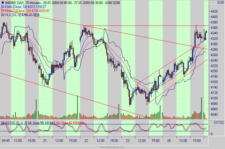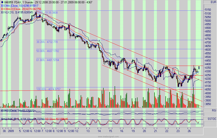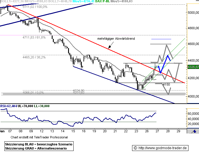 Rückblick: Der DAX hat letzte Woche im Bereich von 4.000/4.050 die Tiefpunkte der Monate Oktober und November erreicht. Der DAX nutzte dies, um eine Zwischenrallye einzuleiten. Der Abwärtstrend des Monats Januar wurde erreicht und Gesternachmittag im Bereich von 4.300/4.315 attackiert.