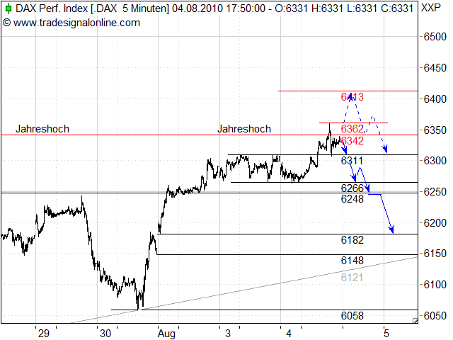 meine einschätzung für heute: das jahreshoch 6342 wurde gestern wie erwartet übersprungen, wenn auch nicht nachhaltig und nicht signifikant. der dax hat gute chancen weiter anzusteigen wenn er den widerstand und das gestrige hoch 6362 überlaufen kann. dann sind 6413 das ziel für heute. aber: solange der dax unter 6342 handelt, ist zunächst mit einer etwas ausgedehnteren konsolidierung zu rechnen. unterstützung 6311, ein break verschafft erstmal korrekturpotenzial bis 6266 und ggf. sogar 6248. fällt der dax auch noch unter 6248, wäre mit einem erreichen des gaps bei 6182/6148 zu rechnen.