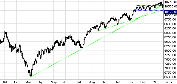 blick nach vorne. mit den ewig gleichen argumenten (liquiditaet, niedrige zinsen, mangelnde anlagealternativen) erwarten die bullen, dass die maerkte "zur normalitaet" zurueckkehren werden und die baeume weiter in den himmel wachsen. natuerlich moeglich, dass die maerkte wieder in den vorwaertsgang schalten, aber die aktuellen argumente reichen dafuer mE nicht. wir liegen immer noch ueber dem niveau von ende oktober/anfang november - haben sich die aussichten seither wirklich weiter verbessert? das ende der superliquiditaet zeichnet sich ganz langsam am horizont ab, und die maerkte schauen zunehmend staerker auf die entwicklung und qualitaet der gewinne. die letzten zahlen lassen da aber z.T. zweifel aufkommen> nach wie vor scheinen die zuwaechse bei vielen unternehmen v.a. aus kosteneinsparungen zu resultieren, hinzu kommen zweifel ueber die kreditqualitaet bei geschaeftsbanken/credit card companies. nun also die obama-initiative, und dabei immer bedenken, dass der loewenanteil der von analysten erwarteten gewinnsteigerung im S&P aus dem bankensektor kommen soll...