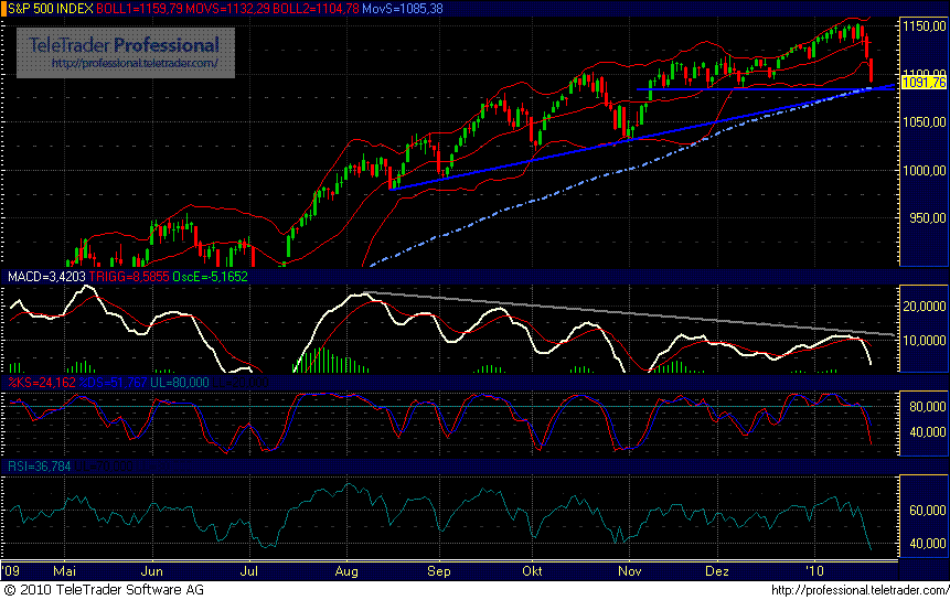 In Amerika reichte die Abwärtsbewegung im Dow annähernd an seinen mittelfr. Aufwärtstrend bzw. den #808000">unteren Rand des Kanals,#00ff00"> #808000">im S&P sind wir noch gut 6 Punkte von diesem entfernt. Ein zentraler Sup befinddet sich zudem im Bereich von 10080 - 10135 Punkte, der davorige Unterstützungsbereich um 10500 Zähler wurde ja bereits letzte Woche brutal nach unten durchstoßen mit insgesamt recht #008080">hohen Volumen. Unterhalb des Bereichs um 10100 Zähler lassen sich die 9910 - 9920 und 9630 als Unterstützungszonen ermitteln.