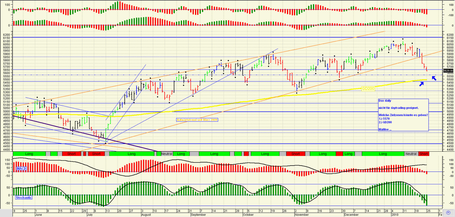 Charttechnisch war es heute auch nicht ganz einfach, die Abstände zwischen den Marken und die Bewegungen fallen deutlich kräftiger aus als noch vor knapp 9 Tagen, zudem sahen wir heute den 4. roten Schlusskurs auf Xetrabasis in Folge - auch en kleiner Rekord aber noch ausbaufähig. Von der Indikatorenseite her beschleunigt sich der Abwärtsimpuls, wie im MACD schön zu sehen, außerdem zeigt das Aroon den fast niedrigsten Wert seit November an und gibt weiter ein leichtes Trendfolgesignal, sprich short.Die 5600 wurde heute noch nicht genommen, zumindest nicht innerhalb des regulären Handels über Xetra, der Dow Jones schaffte es zudem nicht sich über 10280 zu etablieren, damit schlug ein Angriff auf die 10340 fehl.Wichtige Marken für Morgen ist der Bereic um 5600 und das nachbörsliche Tief von Freitag (5570 Punkte ca.), nach oben die alt bekannten, sprich 5667/70 und 5703, letztere blieb heute noch unangetastet, auch ein kleines Zeichen von Schwäche? Auffällig ist, dass das heute Morgen gerissene Gap nicht vollständig geschlossen, sondern im Hoch um nur knapp 2,5 Punkte vefehlt wurde, somit wäre bei bullischer Tendenz Morgen dies das Ziel für die longies, für die Bären das Tief vom Freitag.