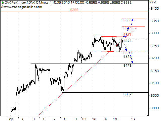 Ausbruch über die 6280 zu Börstenstart nicht zu erwarten, Rücklauf bis in den Bereich 6250/6230 bzw. 6215 (gapclose) wahrscheinlich, Neubewertung nach Arbeitsmarktzahlen um 14.30h