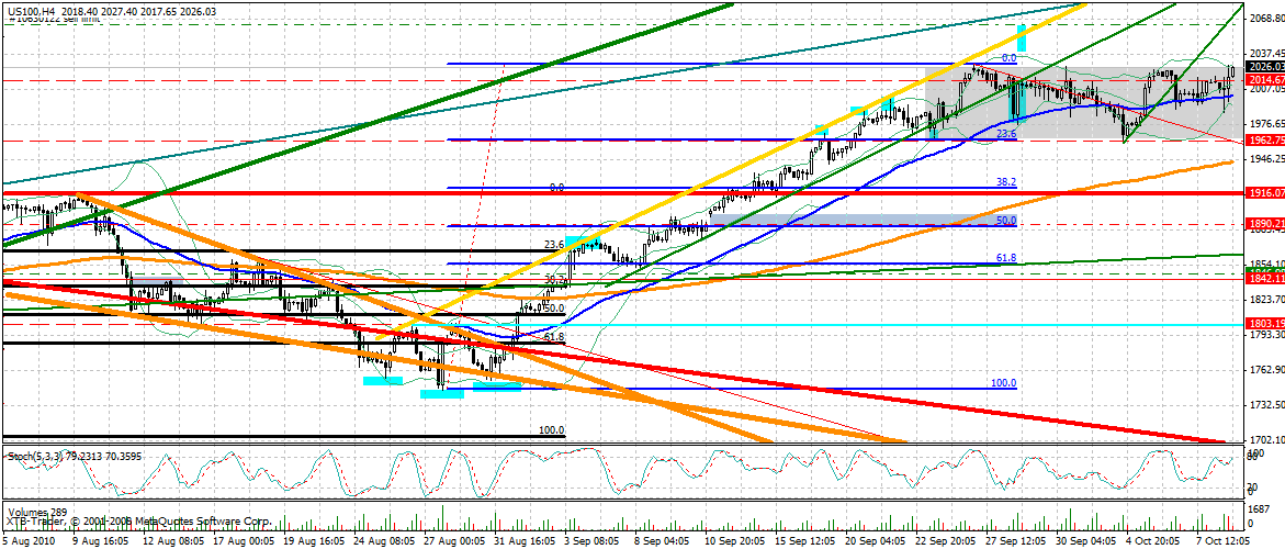 Einen dynamischen Ausbruch dürfte s heute nicht mehr geben. Es könnte aber am Montag soweit sein. Trifft das bullische Szenario zu, dürfte der NDX bis zum JH bei 2065 ansteigen.