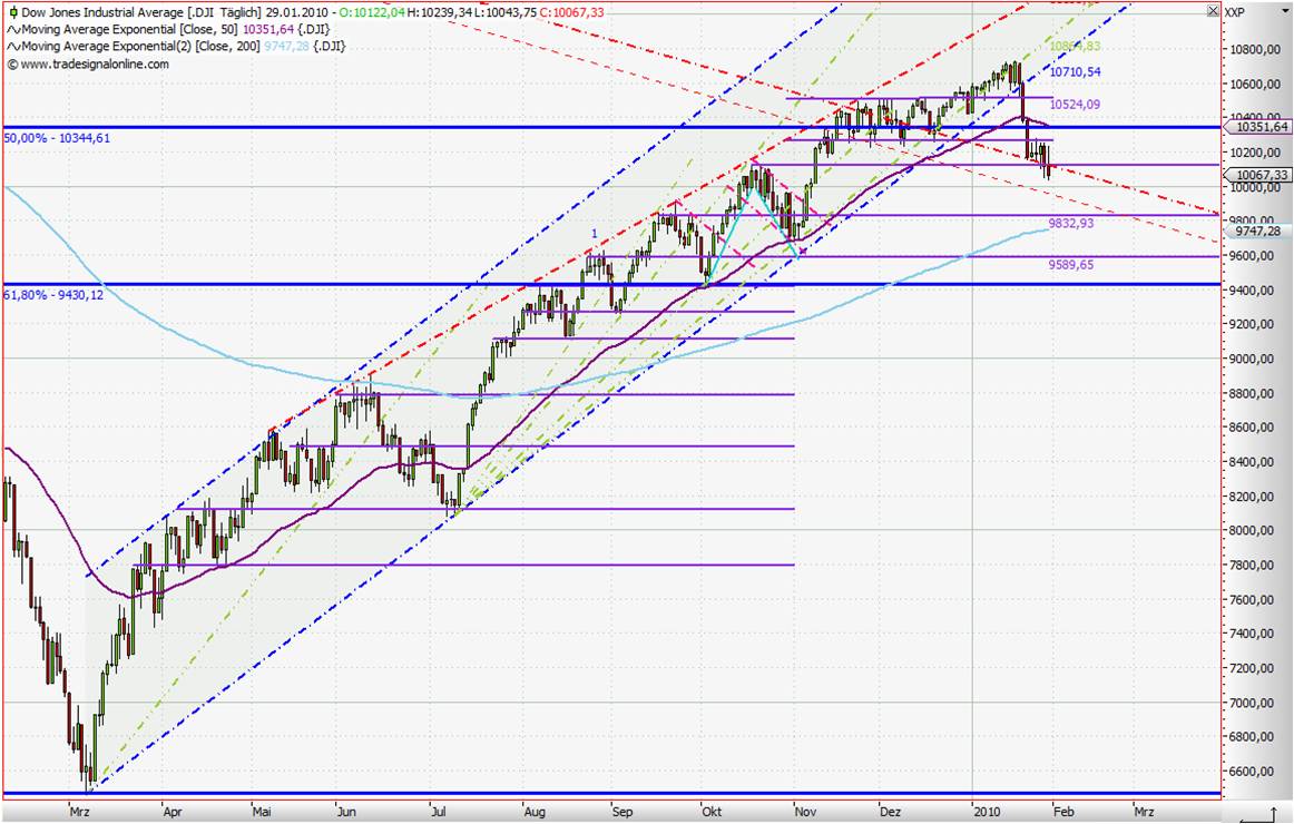 Wir sind unter dem EMA 100 gefallen. Wie gesagt der EMA 50 gilt als nächste Zone wo wir ein Kissback bekommen können, da hier der Widerstand härter ist und die Schelte von Obama und Sarkozy aus Davos zu den Finanzmärkten abgeklungen sein wird. Dax wird dann bei ca. 5400 im EMA 50 liegen.