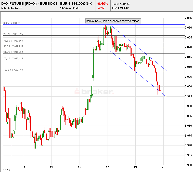 Short zu gehen, bzw nachzulegen (Short). Der Peak war zu erwarten, Kissback an den gebrochenen kurzfristigen Uptrend. Und sonst, auch heute, schwäche auf der ganzen Linie. Dow markiert Jahreshoch, DAX unberührt. Naja, Dow hat die Aussicht ja auch nur kurz genossen. Bei dem dürfte auch erstmal Schicht im Schacht sein, die Jahreshochs dies Jahr liegen alle auf einer steigenden Linie - die kann man als Widerstand bezeichnen.