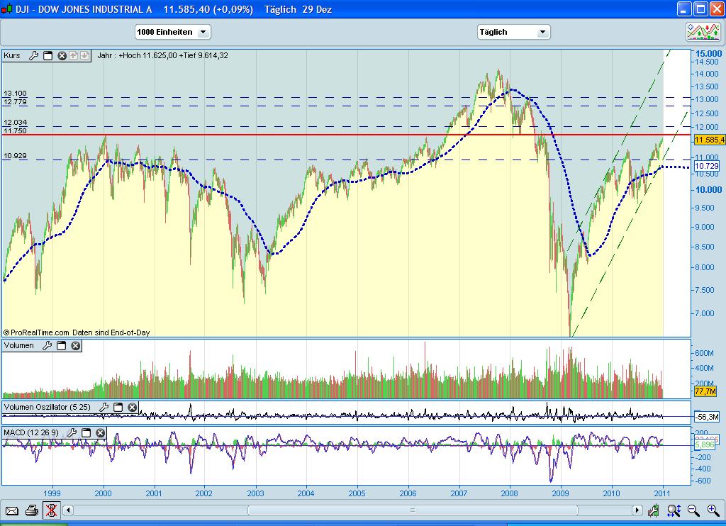 Das Jahr 2010 neigt sich dem Ende zu und die Jahresendstände in den Ami Indizes stehen fast fest - Zeit für einen Ausblick auf 2011: Dafür ist es sinnvoll sich das große Bild anzuschauen. Wir sehen seit 1999/2000 im Dow Jones ein breit angelegte Seitwärtsrange , diese wurde 2007 einmal nach oben und Anfang 2009 nach unten durchszoßen , allerdings orientiert sich der Kurs immer stark zu dem Bereich 9700 bis 11750 Zähler , hier lag der Schwerpunkt der letzten 10 Jahre , auf welchen wir immer wieder zurück kommen - so auch in diesem Jahr gesehen.