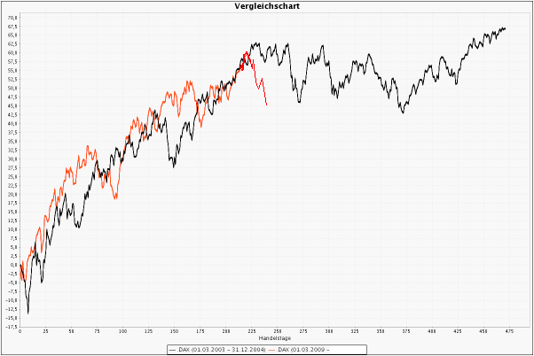Ich habe den Vergleich zu dem Kursverlauf nach dem #003300">Crash 2000 - 2003 nochmal aufgegriffen und übereinander gelegt. Zwar gibt es viele Beispiele, wo eine ähnliche Kursreaktion auf einen Bärenmarkt vorliegt - Beispiele wären die Krise in den 70ern und Anfang der 30er Jahre -, jedoch passen in dem unten gezeigtem Chartbild die "#0000ff">V"-förmige Erholung, die Umsatz- und Marktpositionenseite sehr gut ins Bild.