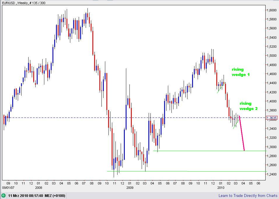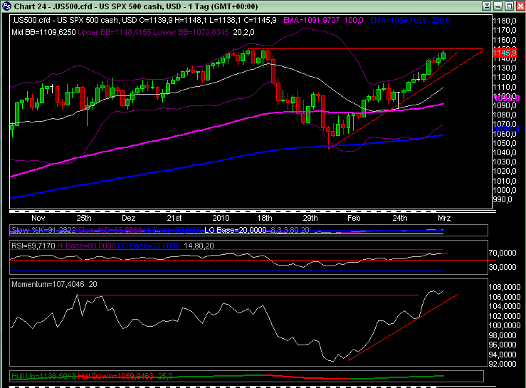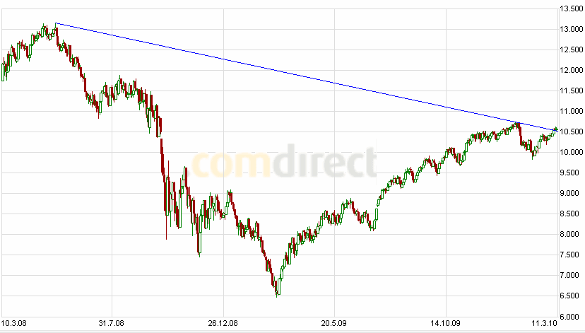 zu wenig an, aber der DOW sollte demnächst mal wieder auf Tauchstation gehen. Bei 10.590 verläuft im DOW jedenfalls das 61,80% retacement vom Abwärtstrend des DOW. Es wurde bisher nicht nachhaltig überwunden und irgendwie sieht es so aus, als ob es dieses mal auch nicht klappen sollte. Nachhaltig meine ich im Wochencandel! Ich versuche mal einen Chart hier reinzustellen, habe aber keine Ahnung, ob und wie lange der Sichtbar sein wird.