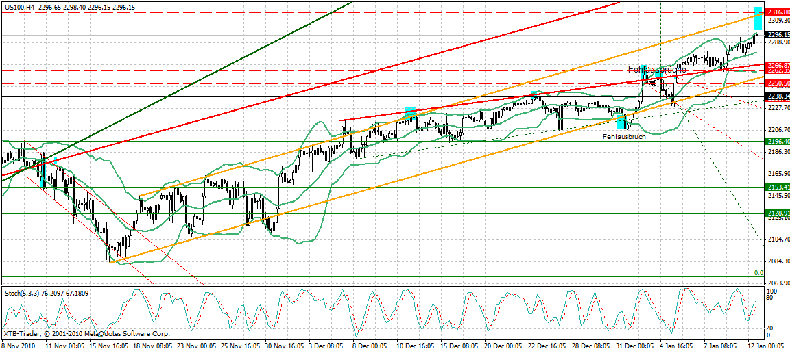 http://www.ariva.de/forum/...-All-Time-High-428557?page=37#jumppos934Der übergeordnete Aufwärtstrendkanal ist vollständig intakt. Die im Dezember noch den Durchmarsch an die Trendkanaloberkante deckelte Rallybegrenzungslinie wurde im neuen Jahr „aufgeweicht“. Spätestens seit dem Durchbruch über das bisherige JH bei 2267 F ist die Wirkung dieser Trendlinie vorbei. Im Umkehrschluss bedeutet dies, dass die Aufwärtstrenddynamik im NDX 100 wieder vorhanden ist.