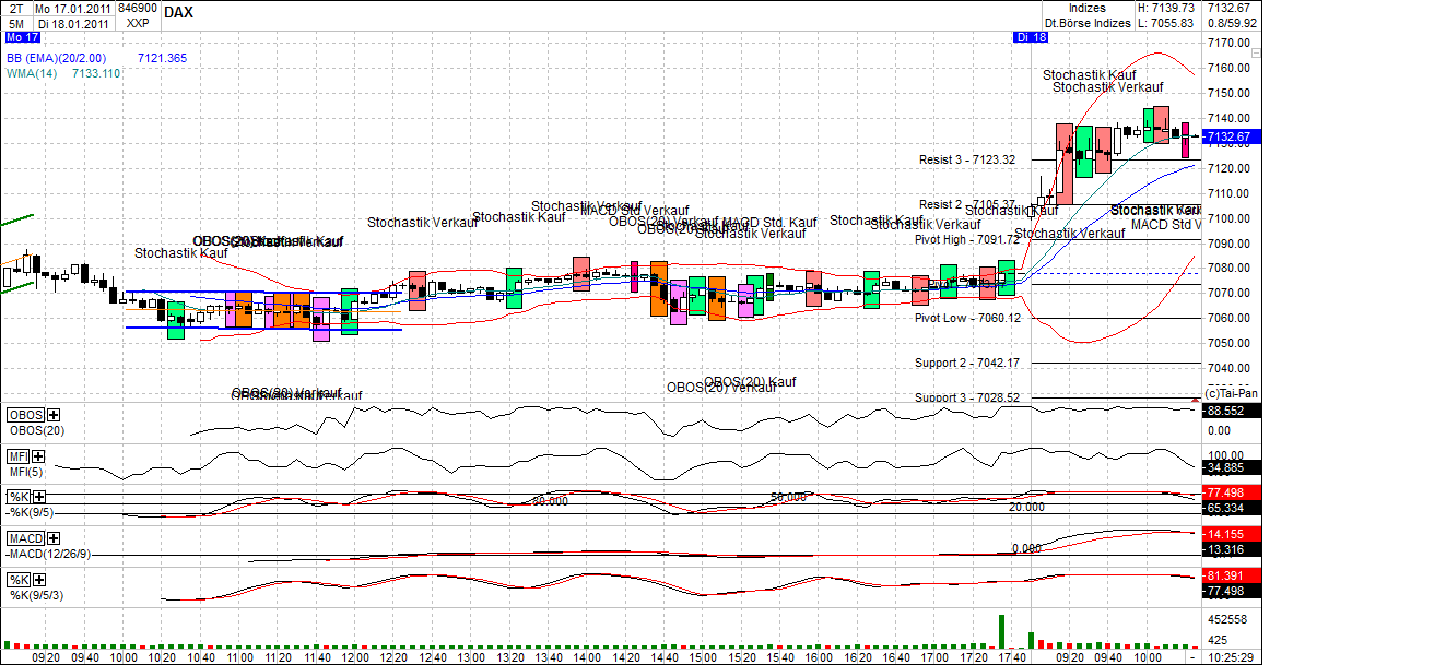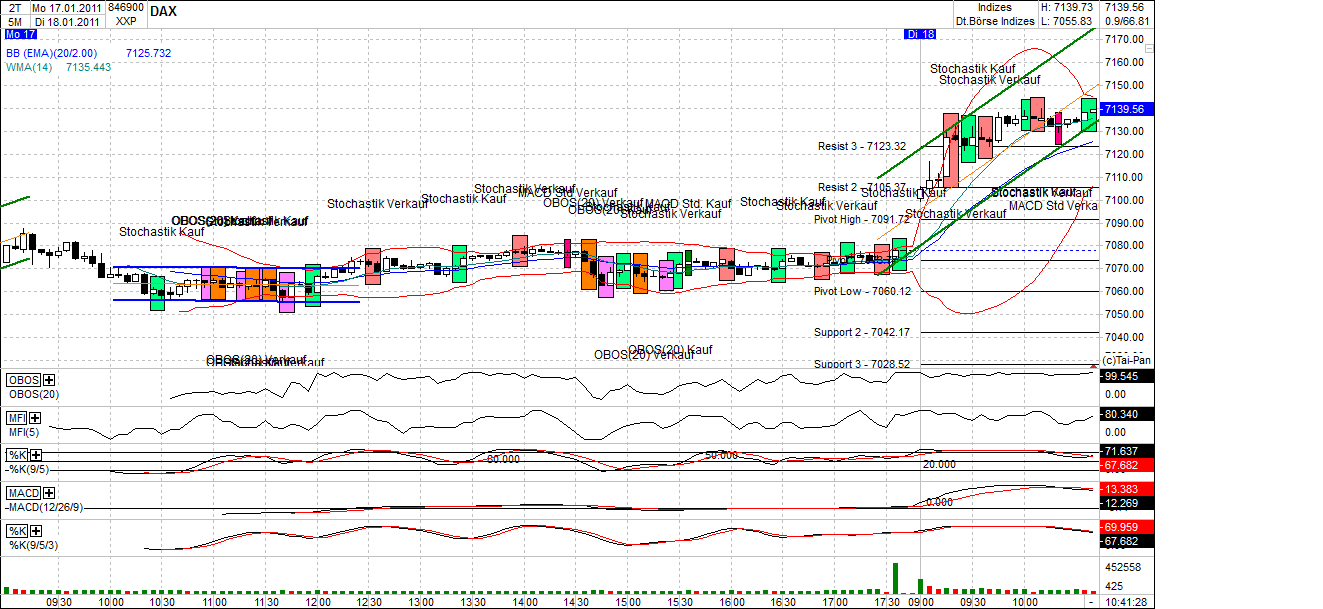 Aktuell liegt das oBB bei 11898. Ob es aber hier zu einer größeren Konsolidierung kommen wird, halte ich gegenwärtig für fraglich, denn das oBB verläuft nahezu horizontal. Das uBB läuft dazu nach oben. Der BB-Körper verengt sich also wieder. Auch in der Rallyphase seit Ende 2005 – zum Alttzeithoch hangelte sich der Kurs nur am steigenden oBB entlang. Gleiches galt für die heftige Abwärtsbewegung bis März 2009 für das uBB. Eine Konsolidierung von 11900 aus könnte allerdings starten.
