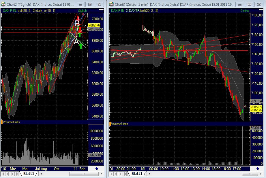 Wir haben es nicht geschafft die 7180 heute Vormittag zu überbieten , die 7090 bis 7080 stützen uns jetzt auf Schlusskurssicht. Darunter verläuft der - noch intakte - Aufwärtstrend bei 7045 Punkten , dieser sollte nicht ein zweites Mal gebrochen werden , dies wäre als Schwäche zu werten und dürfte zu einem Test des mittleren daily Bollingers führen , dieses bei aktuell 7011. Sollte auch dieses auf Schlusskurssicht unterboten werden (falls es im 4h bricht wäre dies bereits kritisch) wäre der Aufwärtsimpuls erstmal beendet , dann würden die 6910 und die 6850 bis 6835 in denn Vordergrund gerückt werden müssen ... insofern wichtig für die Bullen , dass es nicht mehr unter 7000 Punkte fällt.
