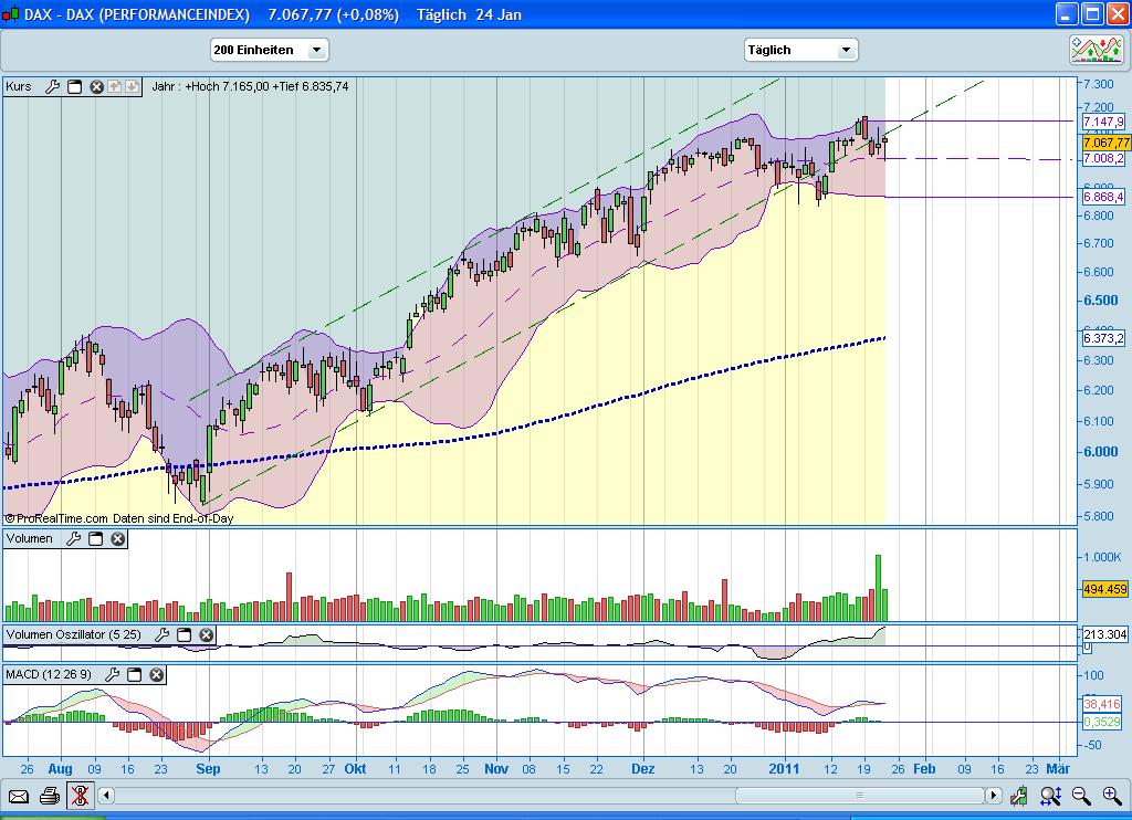 Stützend ist vor allem der Bereich 6990 (7010) - 6910 ... sodass wir feststellen müssen , dass wir momentan auf der Unterseite im Chart gute Unterstützung , zugleich aber auch einen zäheren Widerstand auf der Oberseite sehen , oder - um es kürzer zu formulieren - es ist eine Range , der Ausbruch aus dieser dürfte für weitere Impulse gut sein.