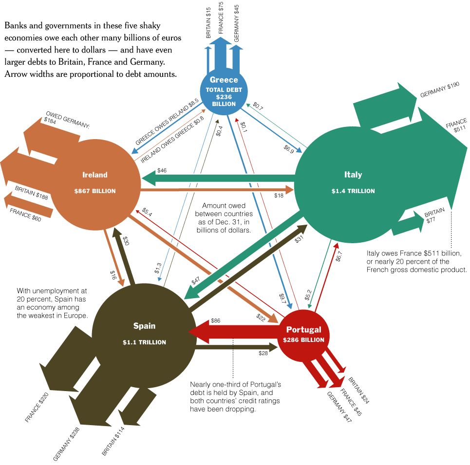 Kurzfristig gesehen wird sich aber diese "Show" weiterführen. Die Bereitschaft mit der die anderen Staaten in der Eurozone Ireland aus der Schuldenkrise verhalfen kann leicht erklärt werden. Die "Exposure" von EU Banken zu Irland, Griechenland und Portugal (lese "PIG") ist massiv, 857 Mrd $, mit Spitzenreiter die deutschen Banken mit einer von über 200 Mrd $ Exposure. Das totale Ausmass kann man an der Grafik unten erkennen.